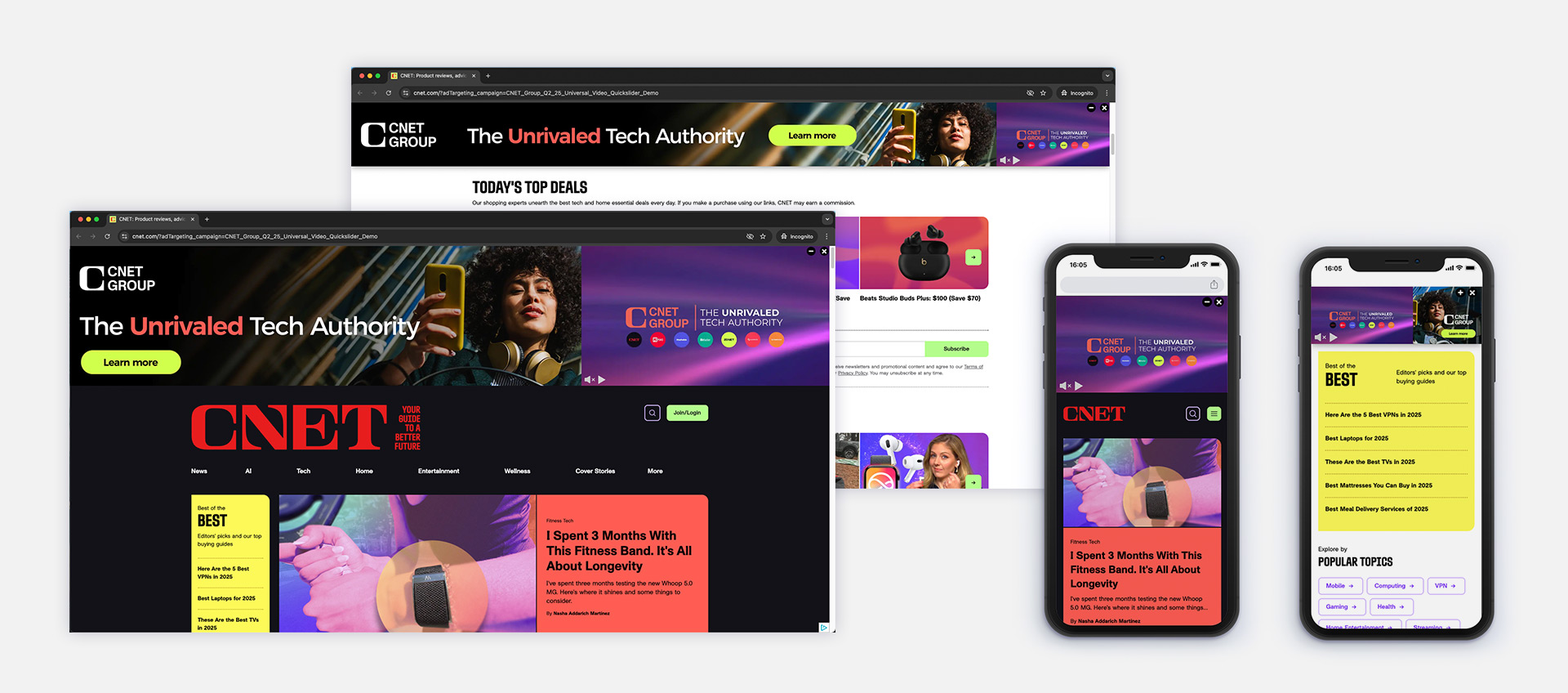 The Quickslider with video format is a high-impact sticky ad that displays above the navigation bar on desktop and mobile.